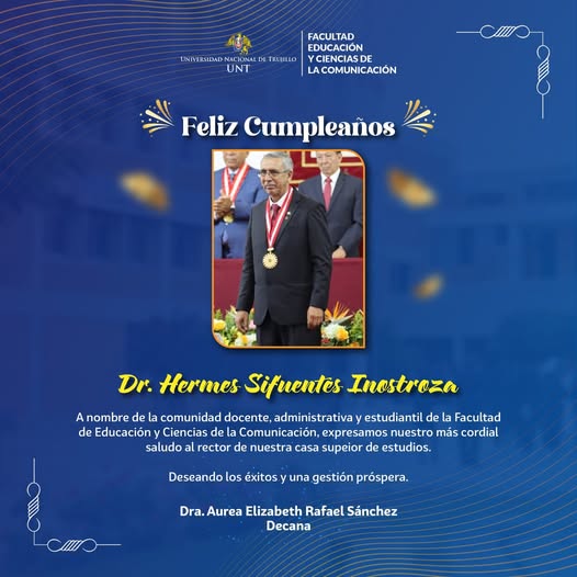 Saludamos al Dr. Hermes Sifuentes Inostroza. A nombre de la comunidad docente, administrativa y estudiantil de la Facultad de Educación y Ciencias de la Comunicación, expresamos nuestro más cordial saludo al rector de nuestra casa superior de estudios. Deseando los éxitos y una gestión próspera.